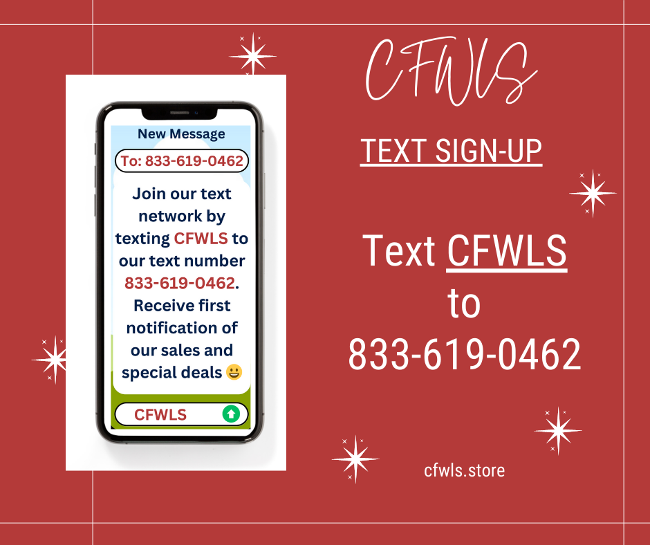 Join our text network by texting CFWLS to our text number: 833-619-0462. Receive 1st notification of our sales and special deals!